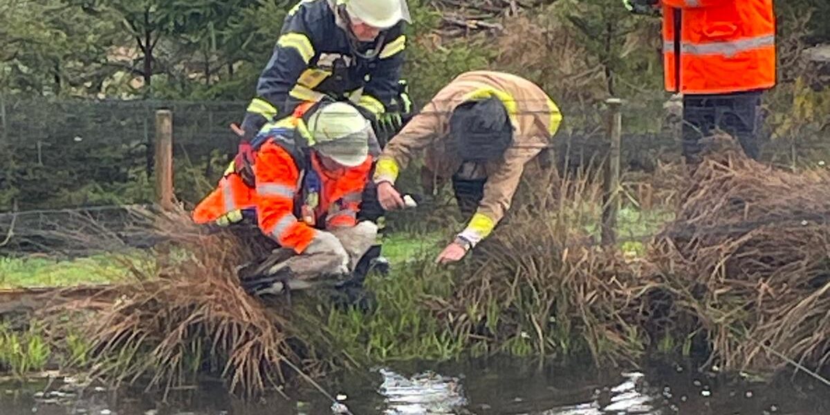 Donnerstagnachmittag wurde die Löschgruppe Nuttlar zur Tierrettung in die Straße Am Roh alarmiert. Hier hatte sich ein Schwan in einem Teichnetz verfangen und drohte zu ertrinken.
