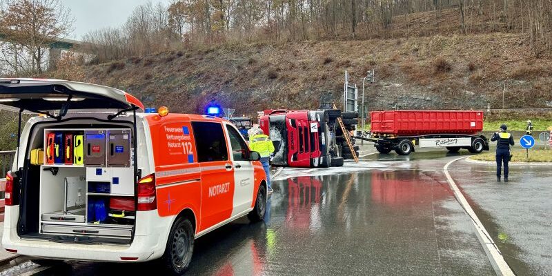 Im Kreuzungsbereich der B7/B480 zwischen Nuttlar und Antfeld war beim Abbiegevorgang ein mit Papierballen beladener LKW umgestürzt. Der Fahrer sollte zunächst im Fahrerhaus eingeklemmt sein. Bei Eintreffen der ersten Einsatzkräfte hatte er seine Fahrerkabine aber schon selber verlassen können. Er wurde vom Rettungsdienst versorgt und anschließend ins Krankenhaus transportiert. Die Einsatzkräfte der Feuerwehr übernahmen die Absicherung der Einsatzstelle und bewegten mit dem Rüstwagen der Anhänger des LKW, der bei dem Unfall stehengeblieben war. Auslaufende Betriebsstoffe streuten die Einsatzkräfte ab. Während der Bergungsarbeiten konnte der Verkehr nur geradeaus in Richtung Antfeld fahren, da der Kreuzungsbereich gesperrt war.