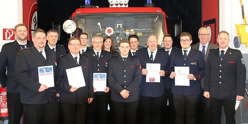 Neun Beförderungen und Ernennungen standen in diesem Jahr bei der Löschgruppe Ramsbeck an. Patrick Wüllner und Sofie Bathen wurden zum Feuerwehrmann und zur Feuerwehrfrau ernannt. Jannik Jostes, Marc Schrot und Michael Kenter wurden zu Oberfeuerwehrmännern befördert. Werner Becker wurde zum Hauptfeuerwehrmann befördert. Philipp Schneider wurde durch die Wehrführung zum Unterbrandmeister befördert. Philipp Tusch wurde nach bestandenem Lehrgang am Institut der Feuerwehr in Münster zum Brandmeister und Olaf Kraft zum Hauptbrandmeister befördert. Zusätzlich erhielt an diesem Abend Daniel Hennemann die Ehrennadel in Bronze für 10 Jahre Mitgliedschaft im deutschen Feuerwehrverband. Besondere Betonung fand im Rahmen der Generalversammlung auch der Dank der Vertreter der St. Hubertus – Schützenbruderschaft Ramsbeck für die gute Zusammenarbeit im vergangenen Jahr und das Engagement der Feuerwehrleute für ihren Ort.